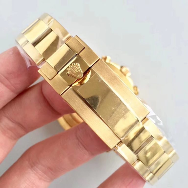 このヨットマスター レプリカには、316Lステンレススチールの上に5ミルという非常に分厚い18Kイエローゴールドのコーティングが施されています。高度なメッキ技術が採用されているため、ケースからブレスレットに至るまで、ゴールドが摩耗したり色褪せたりする心配は一切ありません。